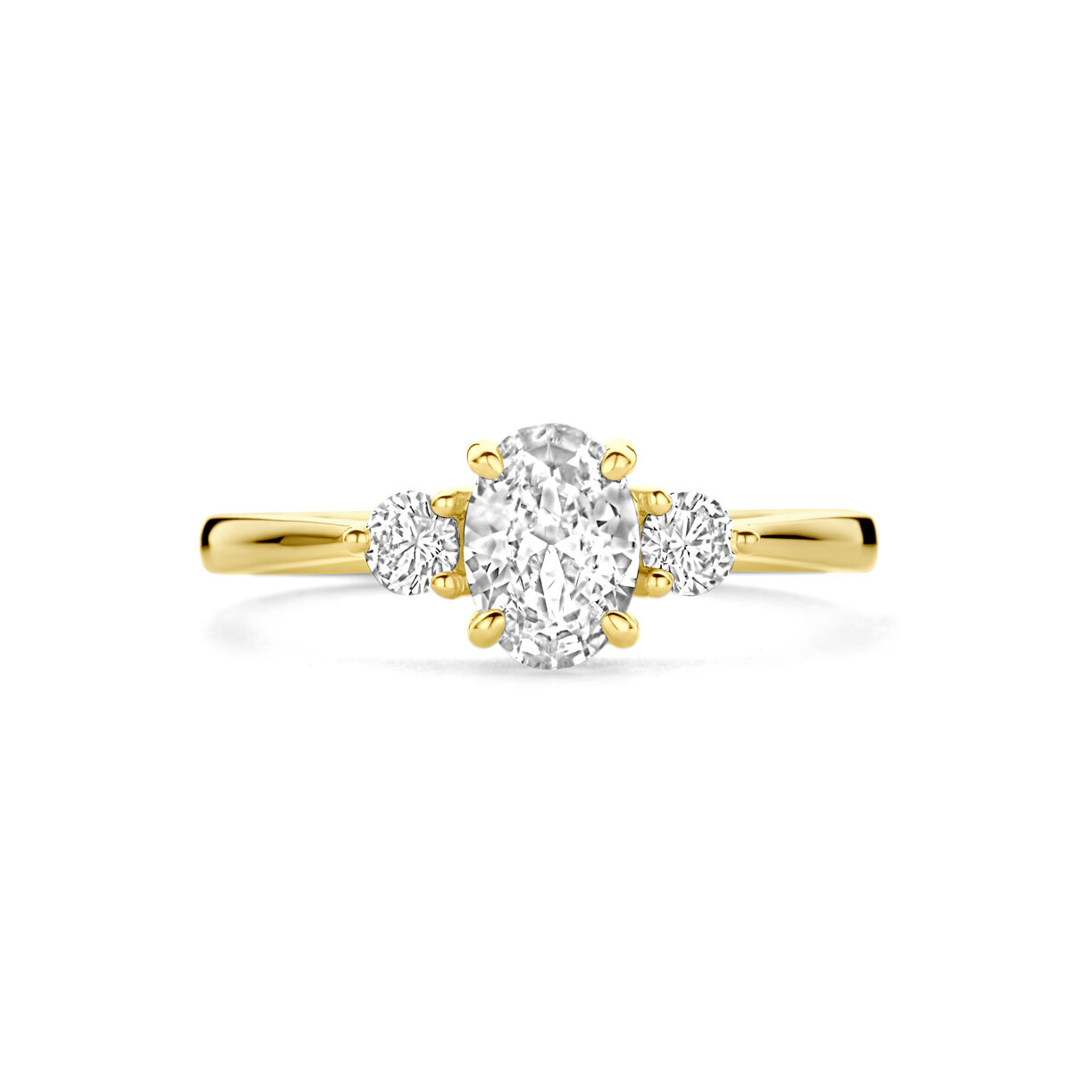 14 karaats geelgouden ring met 3 zirkonia's maat 54 en verkrijgbaar in diverse andere maten