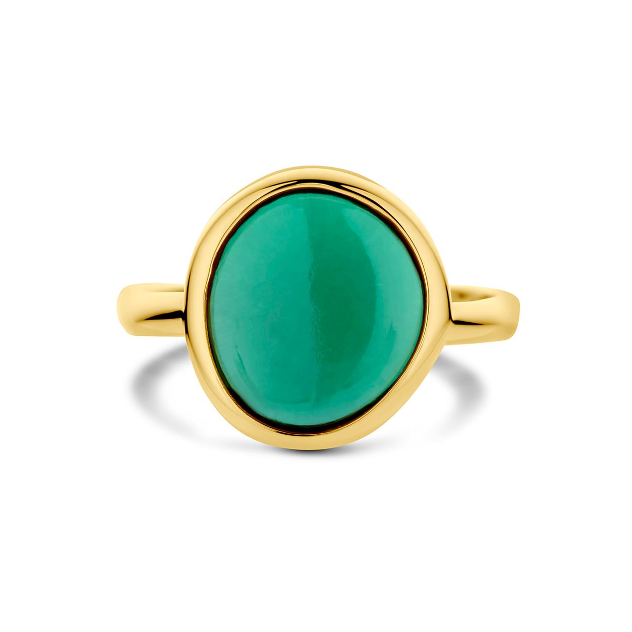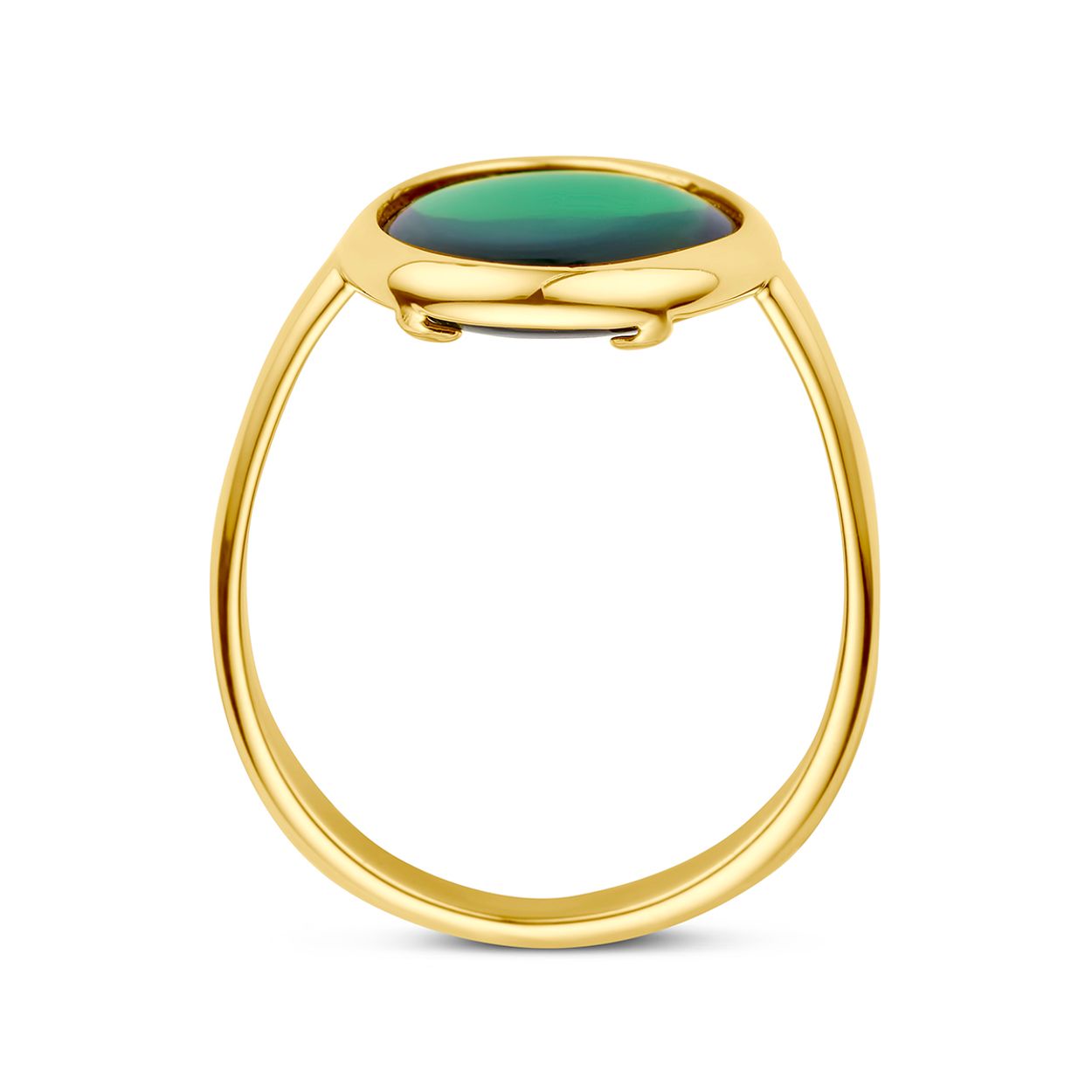 14k Geelgouden ring uitgevoerd met groene toermalijn. De ring heeft een breedte van 13.5mm.