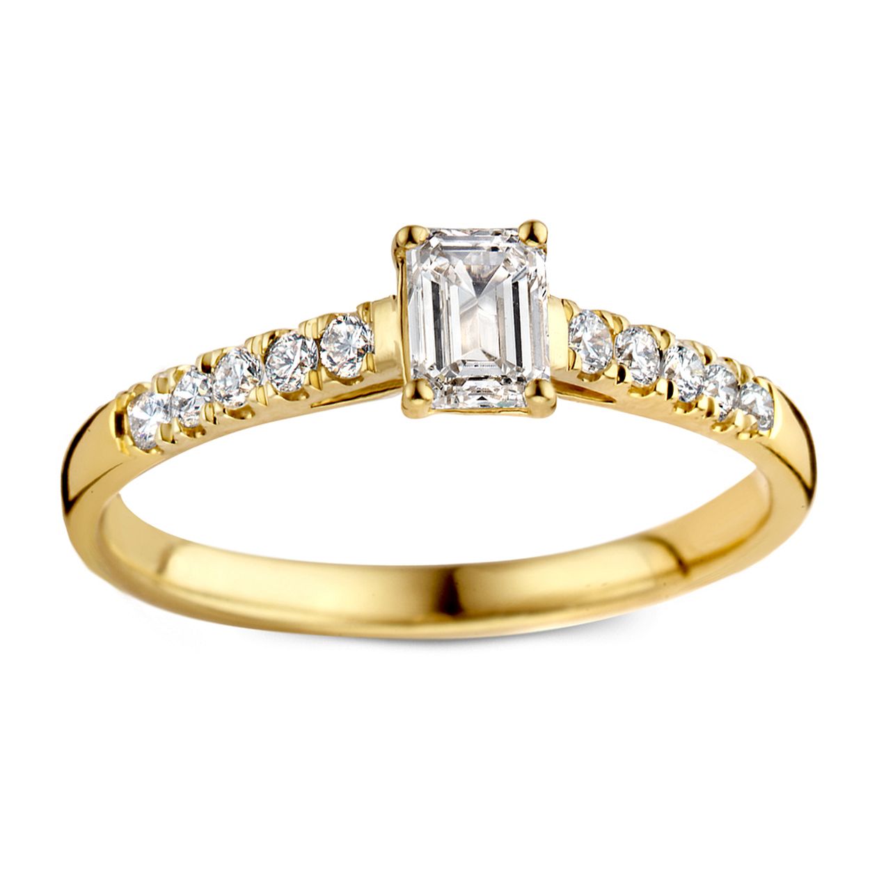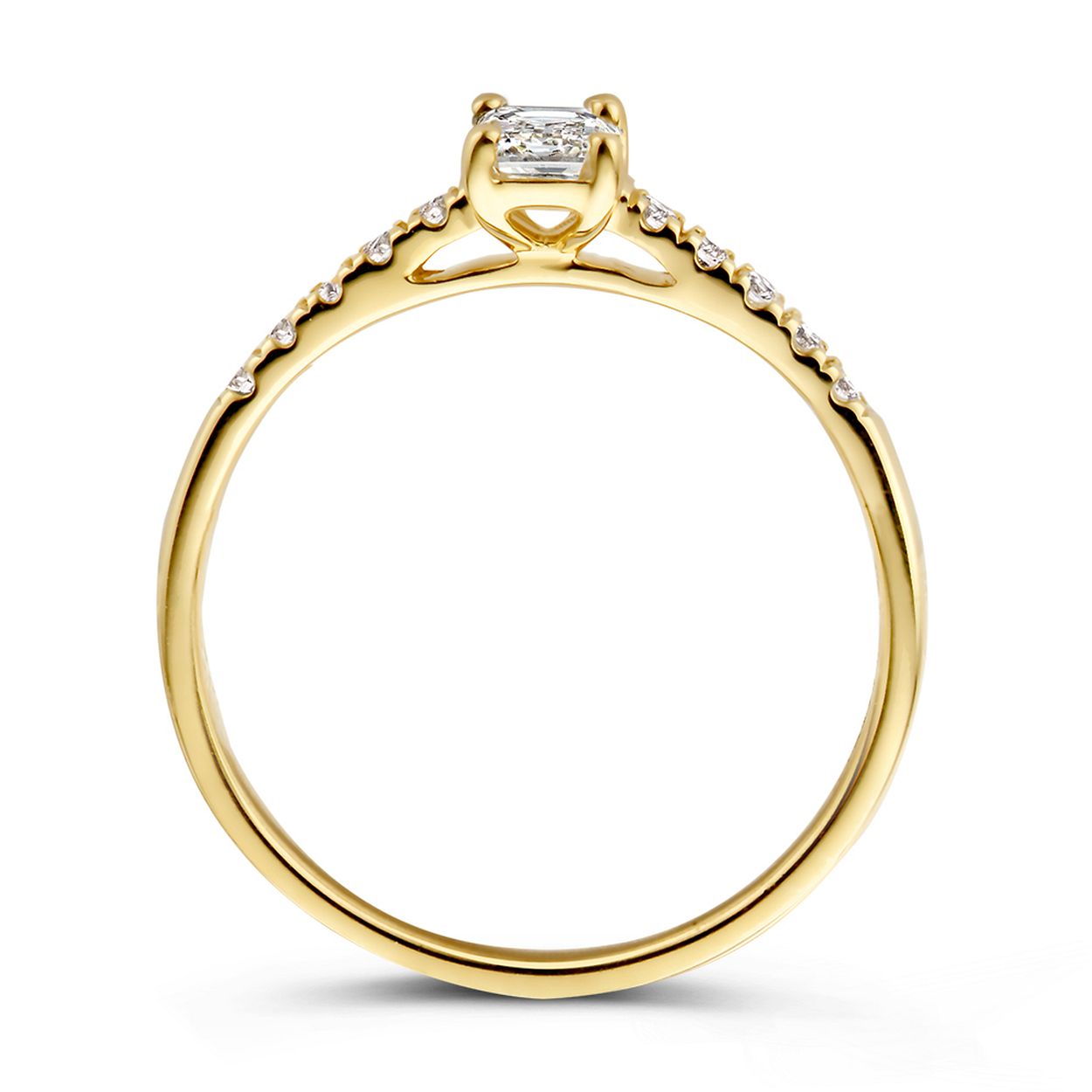 Aurore 18 krt geel gouden solitair ring 'Nora Royal' met zijstenen. De middensteen 0.30 crt emerald  lab grown diamant, 10 briljant geslepen zijstenen lab grown diamant 0,18 crt