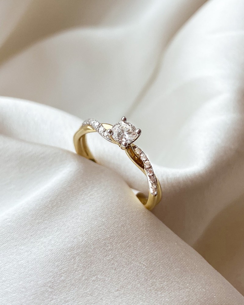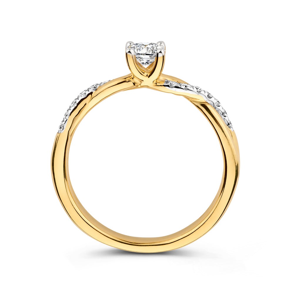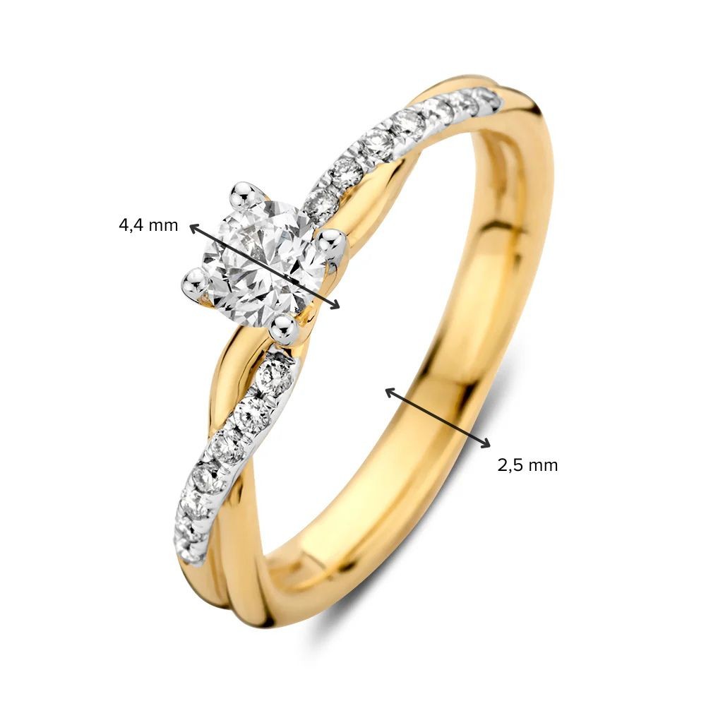 De geelgouden ring 'Mia' is een meesterwerk van verfijning, met een betoverende solitair briljant middensteen van 0,30 ct. en een prachtige twistband, versierd met 14 sprankelende briljanten. Deze ring combineert klassieke elegantie met een moderne twist, waardoor hij perfect is voor elke gelegenheid.