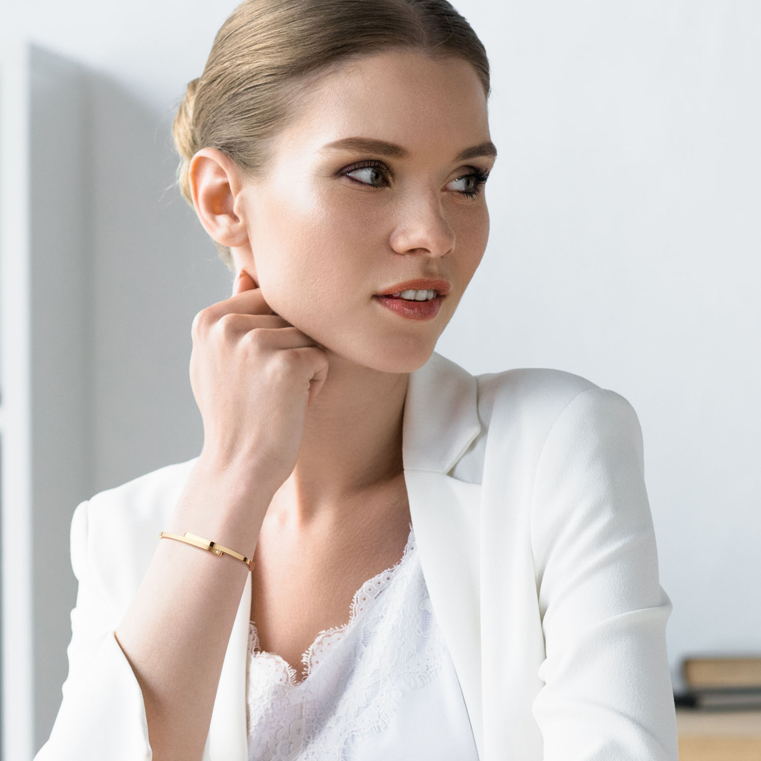 Deze unieke titanium bangle armband van Boccia Titanium is een mooie toevoeging aan je sieradencollectie! Wat deze goudkleurige titanium armband uniek maakt, is dat hij aan de bovenkant parallel loopt in tegengestelde richting met een diamant van 0,02ct in het midden. Een chique geheel. De doorsnee is 60mm. Combineer de armband met bijpassende sieraden voor een complete look.