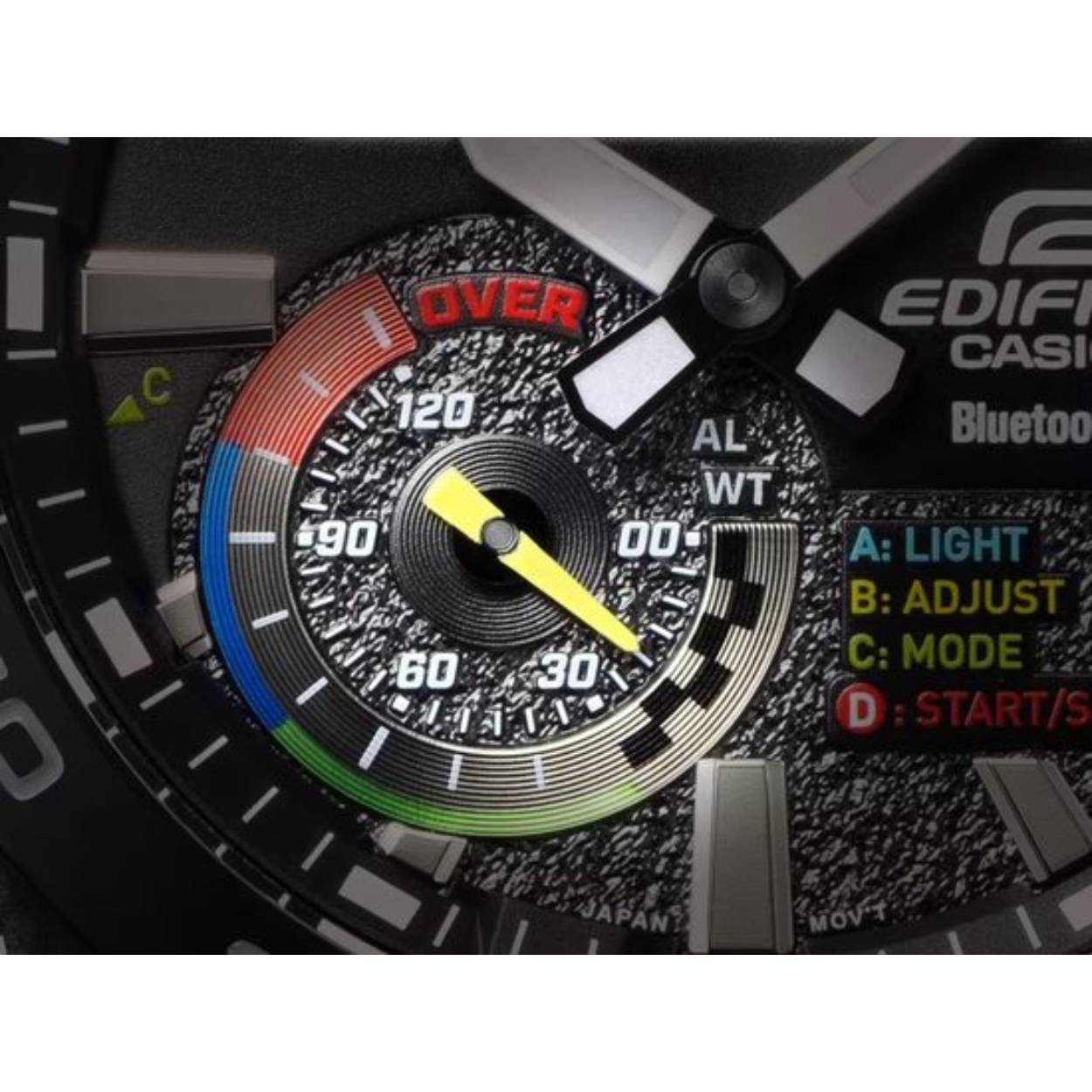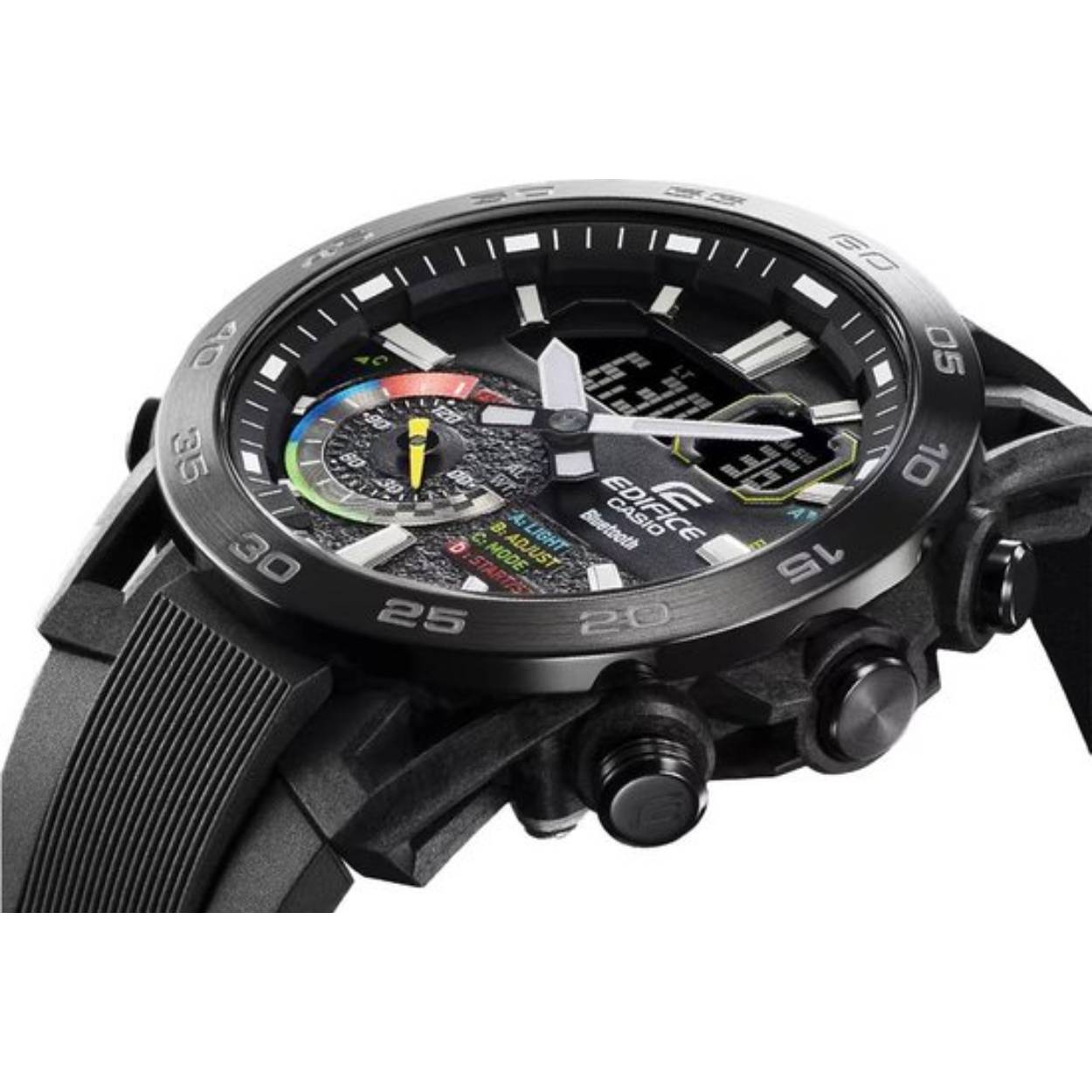 Maak kennis het beste motorsporthorloge. De EDIFICE SUSPENSIONE ECB-40 heeft het allemaal; vorm, functionaliteit en verfijning. Het horloge beschikt over een horlogekast van met koolstofvezel versterkt hars en Smartphone Link. Het unieke ontwerp van de kast is geïnspireerd op de wielophanging van racewagens, met vier draagarmen in een dubbele gevorkte ophanging, twee boven en twee onder. Met koolstofvezel versterkte hars zorgt voor een lichte, maar toch sterke kast. Dankzij Smartphone Link maakt dit bijzondere uurwerk automatisch verbinding wanneer het binnen het bereik van een gekoppelde smartphone komt. Gebruik de speciale app voor toegang tot de functies die zo belangrijk zijn voor raceteams, zoals automatische nauwkeurige tijdregistratie, moeiteloos beheer van de wereldtijd en het overzetten naar je smartphone van de stopwatchgegevens van tot wel 200 rondetijden die op de milliseconde zijn gemeten. Het dubbele ledlicht met hoge lichtsterkte van de Super Illuminator verlicht het digitaal-analoge display, zodat het zelfs in het donker goed leesbaar is.
