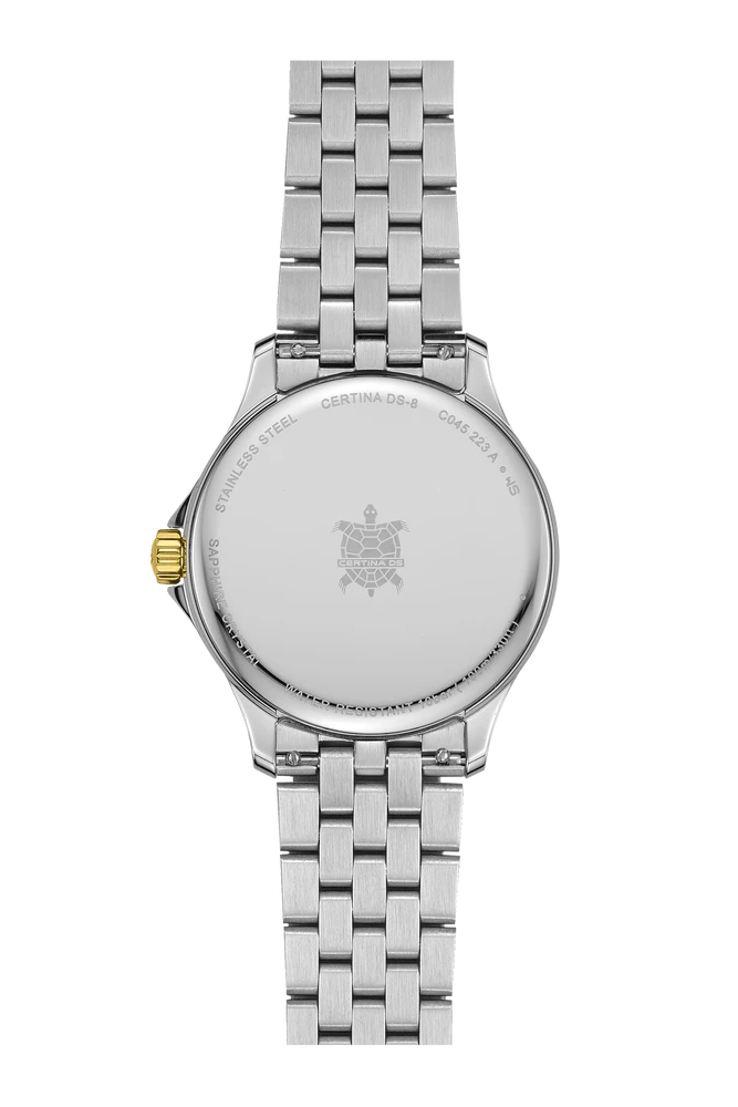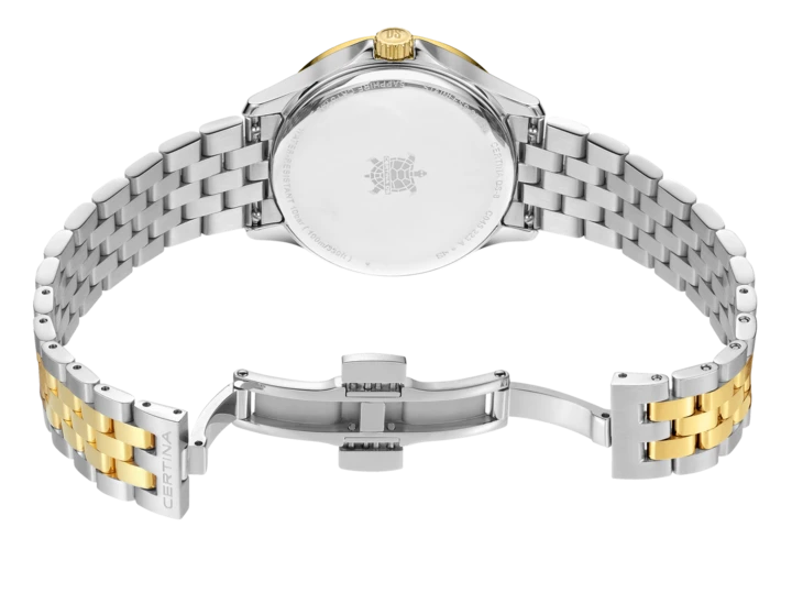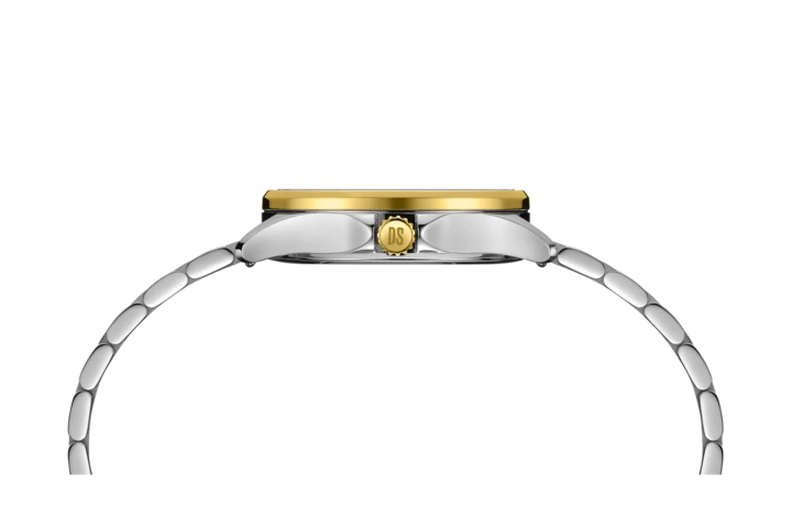 Dit horloge is voorzien van een parelmoer wijzerplaat met een maanstand.