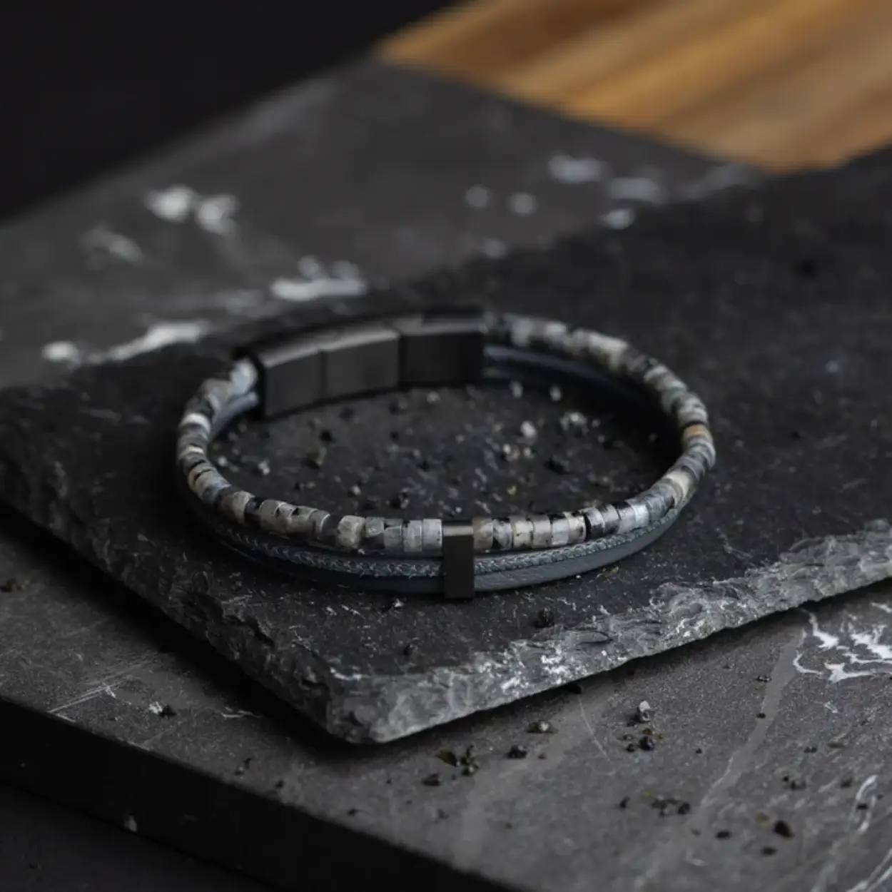 De Triplux Grey armband is gemaakt van echt Italiaans nappaleer en 2mm Larvikiet stenen uit Noorwegen.