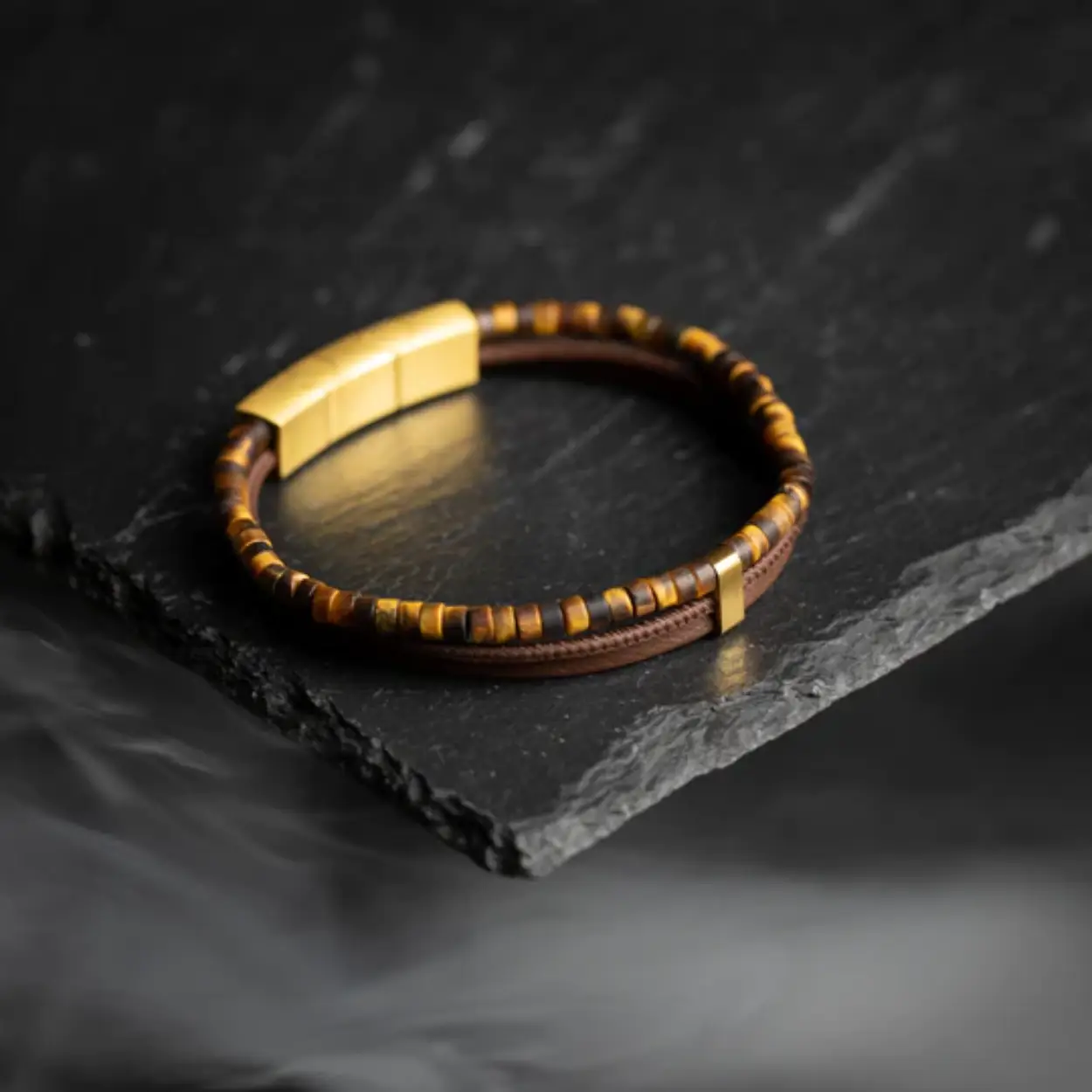 De Triplux Brown armband is gemaakt van echt Italiaans nappaleer en Tijgeroog stenen van 2mm. Hij krijgt een extra tussenstukje mee zodat je de armband met +-1 cm van maat kan veranderen.
