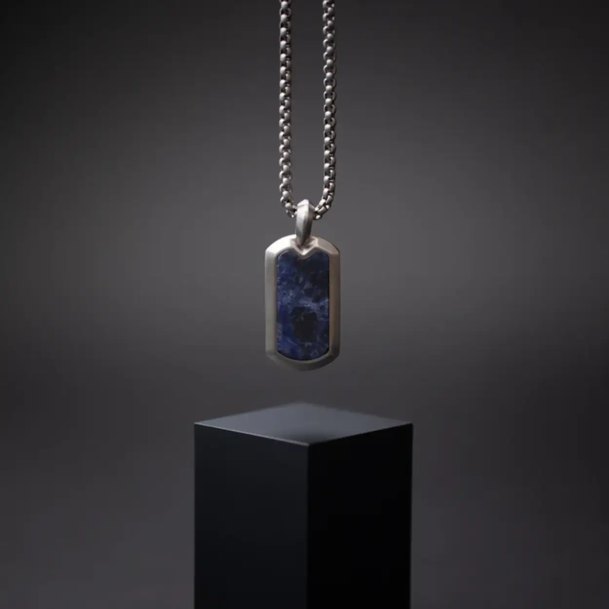 De Imperium Blue halsketting is het pronkstuk van onze collectie. Deze 3mm halsketting werd gemaakt met Japans titanium en afgewerkt met een blauwe Jeremejeviet natuursteen.