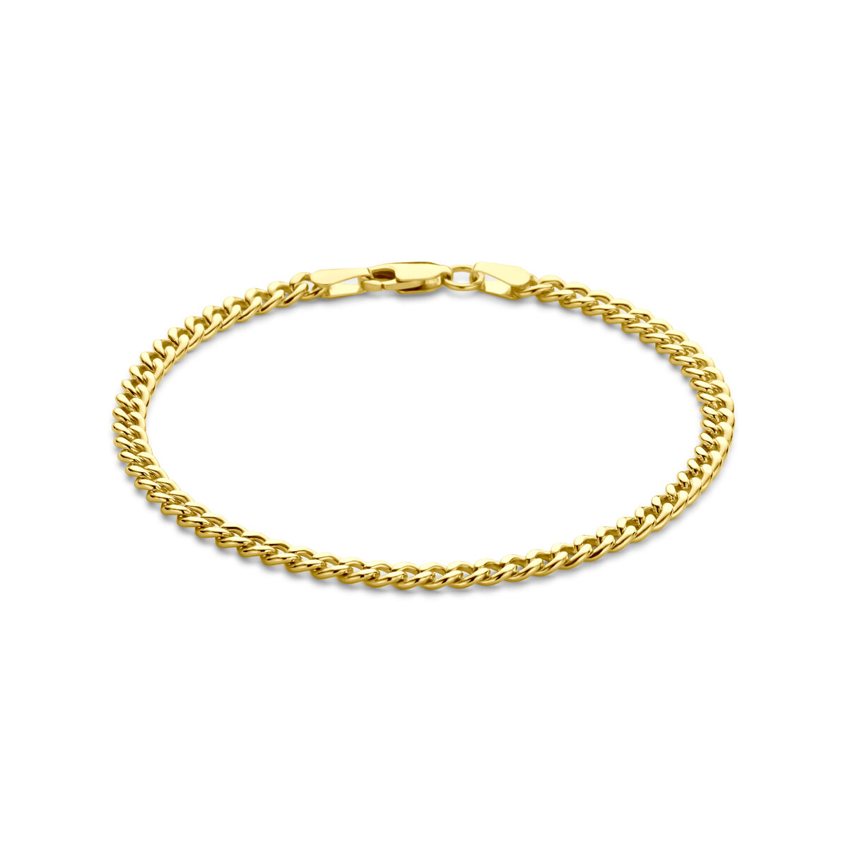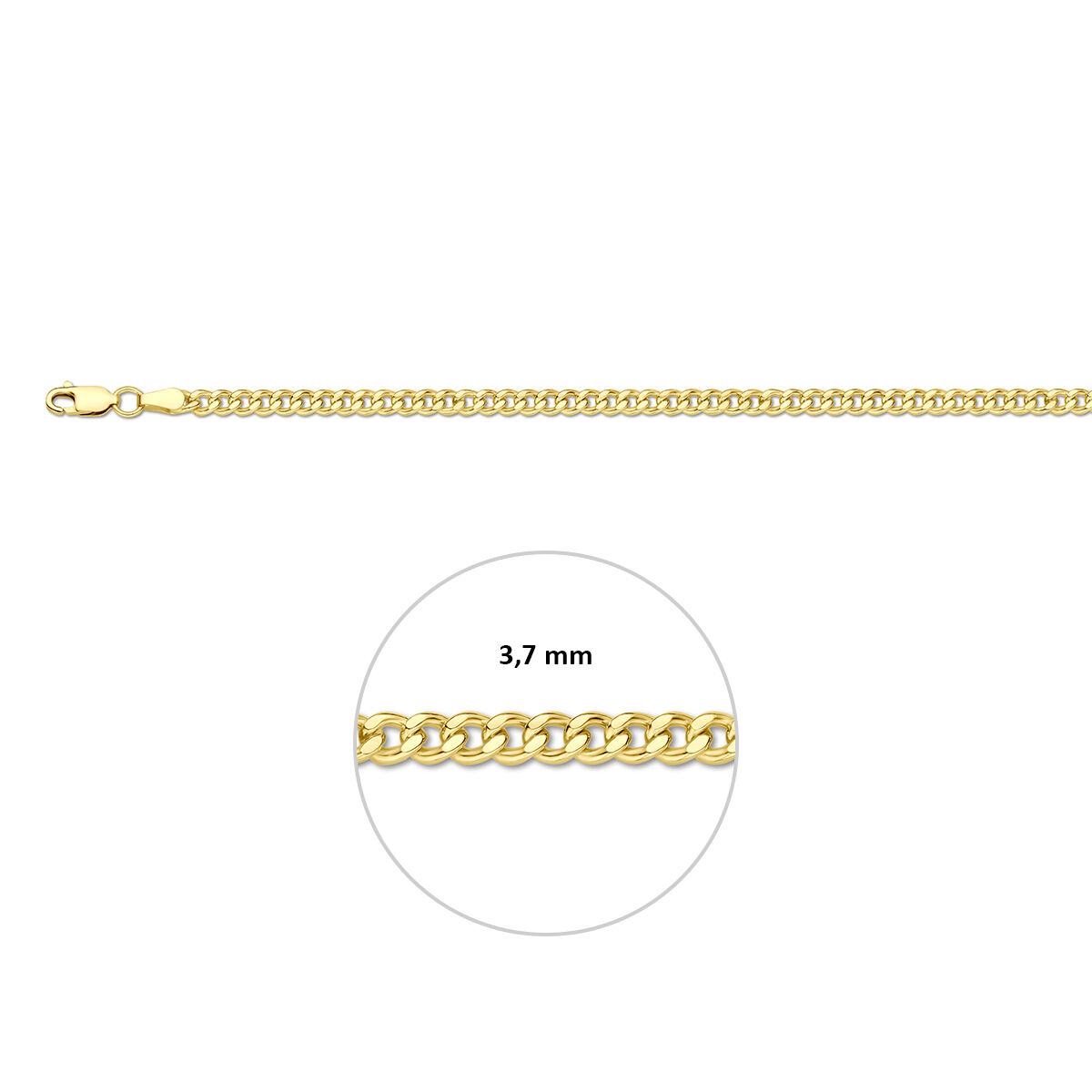 14k Geelgouden lengteartikel met een kern van 925 zilver. De schakelbreedte is 3.7mm. Uitgevoerd met karabijnsluiting.