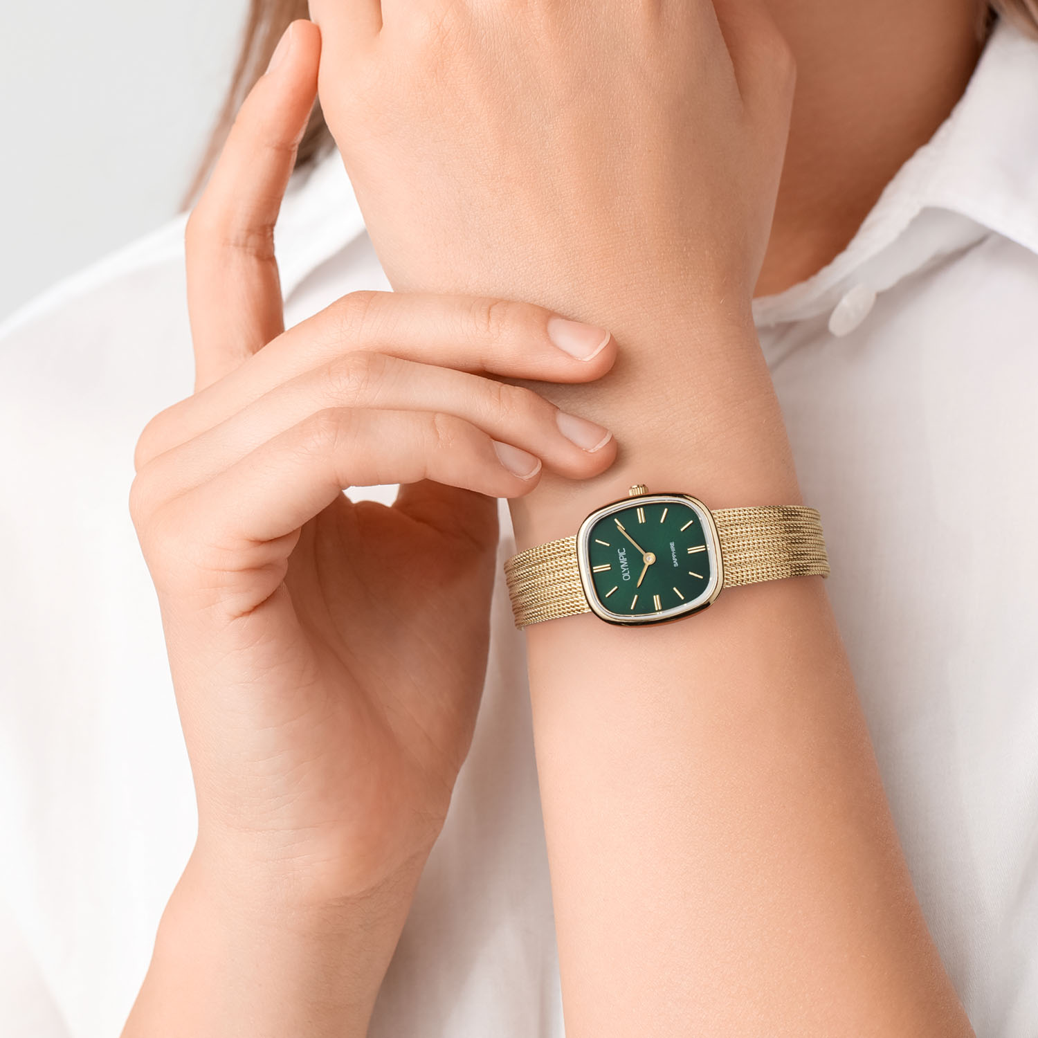 Dit unieke Olympic horloge met artikelnummer: OL73DDS002 is een dameshorloge met een classic chique uitstraling. Het horloge heeft een rechte stalen goudkleurige kast met een groene sunray wijzerplaat en fijne uursaanduiding. Direct aan de kast zit een goudkleurige milanese band. Het horloge heeft een saffierglas, een afmeting van 23x25mm en is 3ATM.