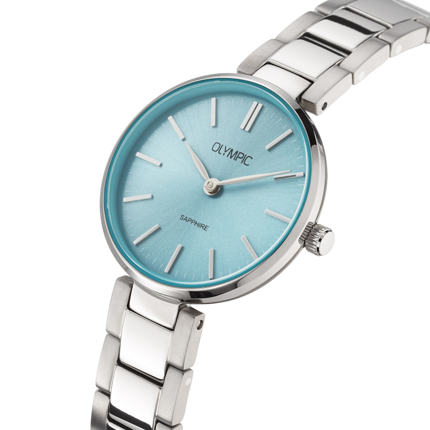 Dit unieke Olympic horloge met artikelnummer: OL80DTT002 is een dameshorloge met een classic sportieve uitstraling. Het horloge heeft een ronde titanium kast met een glanzende bezel en een licht blauwe wijzerplaat met zilverkleurige uursaanduiding. Aan de kast zit een titanium schakelband met een vouwsluiting. Het horloge heeft een saffierglas, een doorsnee van 28mm en is 5ATM.