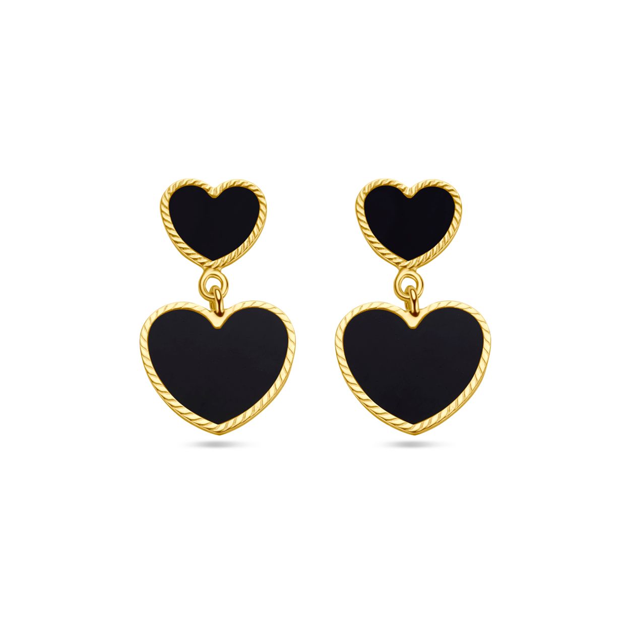 14k Geelgouden oorhangers uitgevoerd met twee hartjes en onyx. De oorhangers hebben een totale hoogte van 21mm.