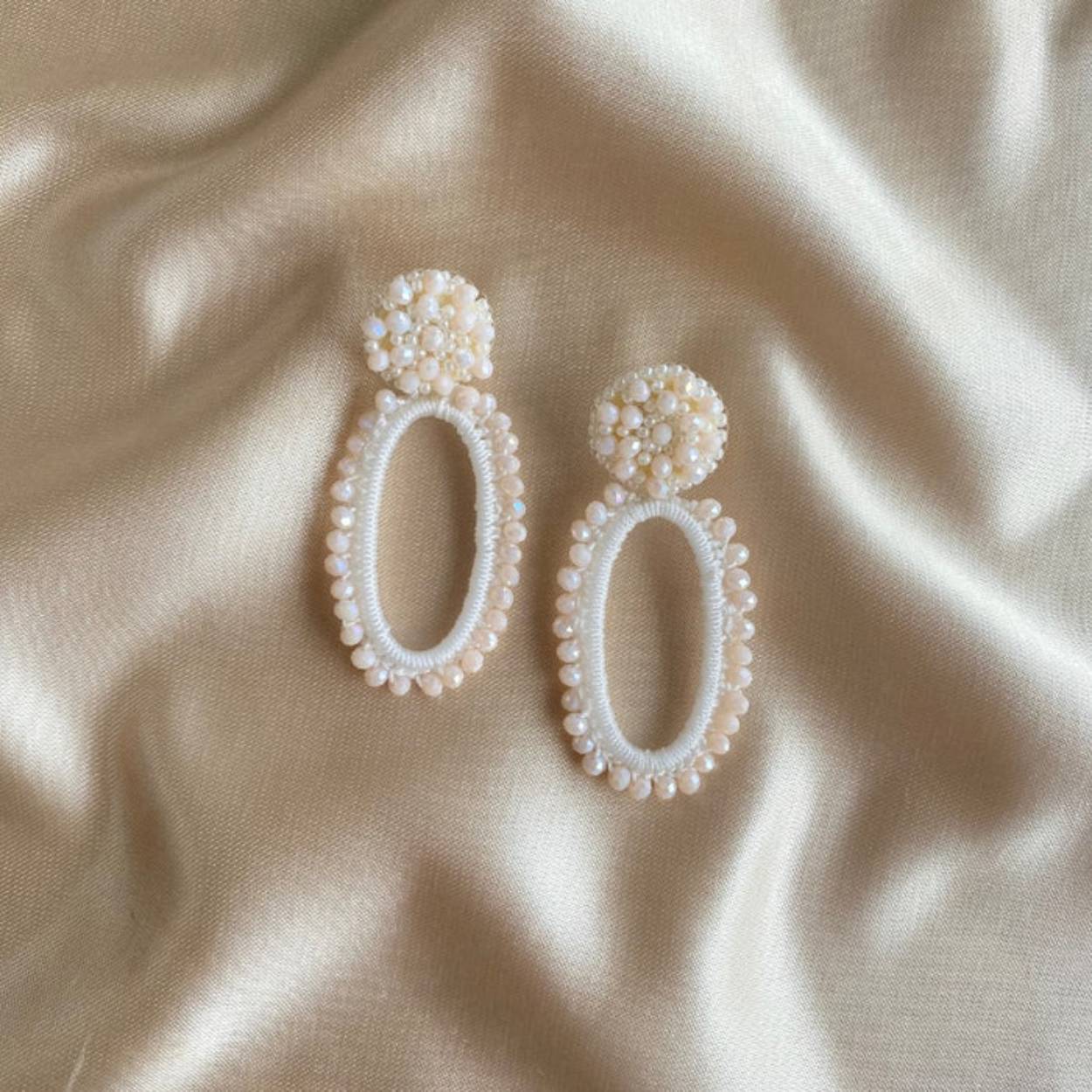 Handgemaakte oorbellen waarbij textiel en kralen zijn gebruikt