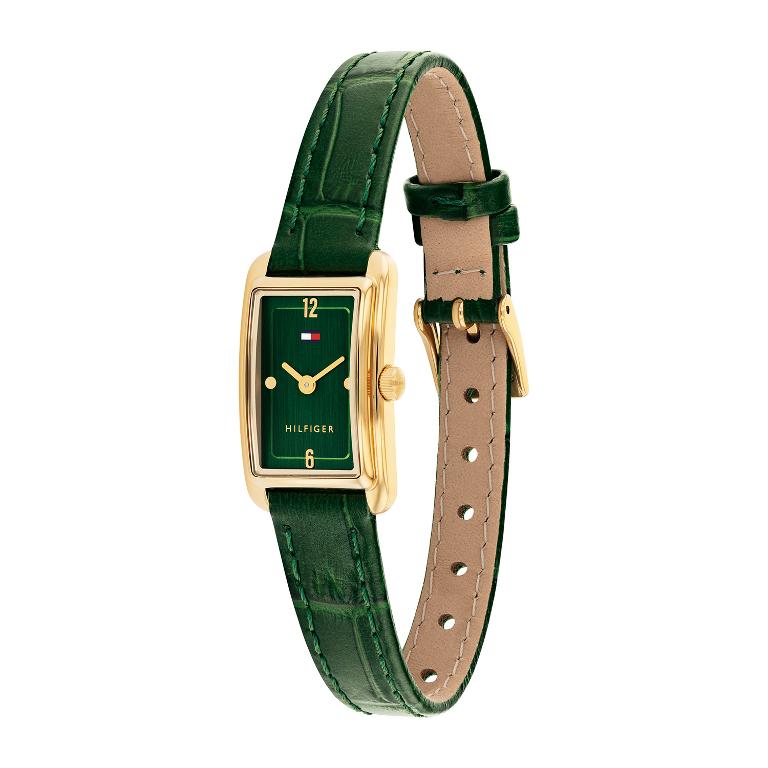 Dit specifieke horloge van Tommy Hilfiger uit de Madison serie met artikelnr: TH1782850 is een casual dameshorloge die niet in je collectie mag ontbreken. Het stalen dameshorloge heeft een rechte goudkleurige kast met een gladde rand en een groene geborstelde sunray wijzerplaat met het Tommy logo. Aan de kast zit een groene lerenband met een gespsluiting. Het horloge heeft een mineraalglas, een afmeting van 16x22mm en is 3ATM.
