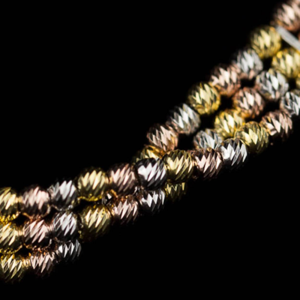 Elegant armbandje van drie rijen met afwisselend schitterende bolletjes van zilver, rosé en verguld vermaakt tot een mooi geheel. Made by Sanjoya.