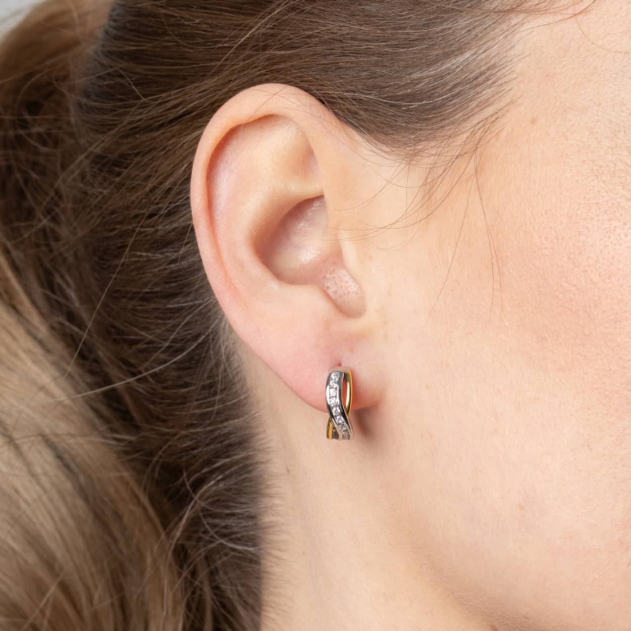 Zilveren oorringen met golvende lijn met zirconia deels geelgoud verguld.