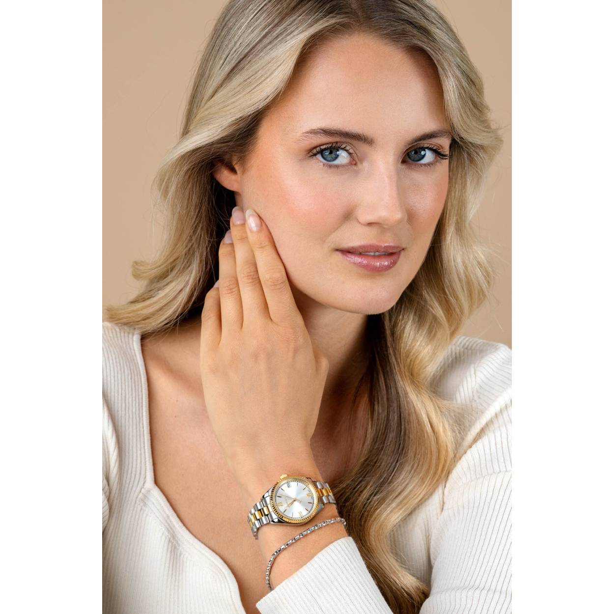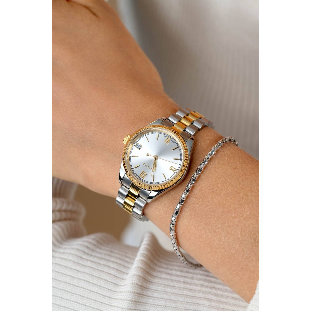De ICONIC watch van ZINZI heeft een herkenbaar tijdloos ontwerp en een subtiel formaat van 30mm. Voorzien van een opvallende goudkleurige gekartelde rand rondom het glas, dat zorgt voor een schitterende luxueuze uitstraling. Het dameshorloge heeft een zilverkleurige 'sunray' wijzerplaat met Romeinse cijfers, datum met dag-aanduiding en een stoere stalen bicolor band met chique clip-sluiting. Leuk detail: de seconde wijzer met een subtiel hartje. Ook 5atm waterbestendig (tegen regen en spatwater) en met sterk mineraal glas.